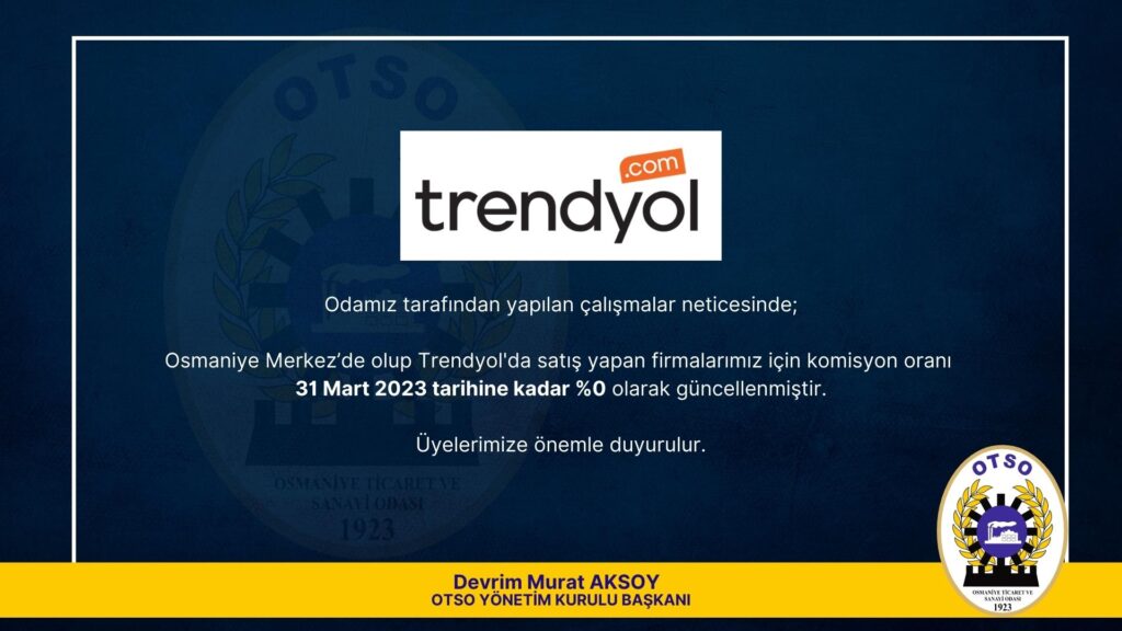Osmaniye Merkez’de olup Trendyol’da satış yapan firmalarımız için komisyon oranı 31 Mart 2023 tarihine kadar %0 olarak güncellenmiştir.