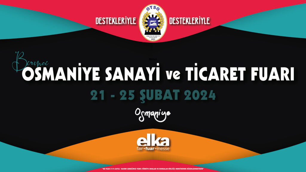 Kuruluşumuz Elka Fuarcılık Limited Şirketi tarafından, Osmaniye Valiliği, Belediyesi, Ticaret ve Sanayi Odası, Borsa, Ziraat Odası, İl Tarım ve Orman Müdürlüğü başta olmak üzere ilçeleri de dahil olmak üzere bir çok kamu kurum ve kuruluşlarının destekleri ile ilk kez düzenlenecek olan 1.Osmaniye Sanayi ve Ticaret Fuarı, 21-25 Şubat 2024 tarihleri arasında Semt Pazarı Merkez/Osmaniye adresinde gerçekleşecektir.