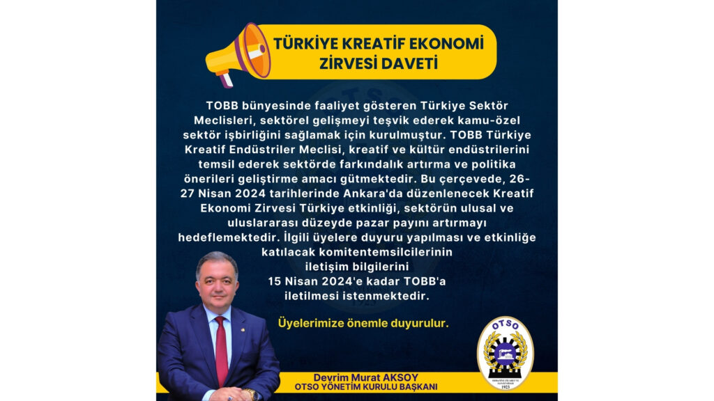TOBB bünyesinde faaliyet gösteren Türkiye Sektör Meclisleri, sektörel gelişmeyi teşvik ederek kamu-özel sektör işbirliğini sağlamak için kurulmuştur. TOBB Türkiye Kreatif Endüstriler Meclisi, kreatif ve kültür endüstrilerini temsil ederek sektörde farkındalık artırma ve politika önerileri geliştirme amacı gütmektedir. Bu çerçevede, 26 27 Nisan 2024 tarihlerinde Ankara’da düzenlenecek Kreatif Ekonomi Zirvesi Türkiye etkinliği, sektörün ulusal ve uluslararası düzeyde pazar payını artırmayı hedeflemektedir. İlgili üyelere duyuru yapılması ve etkinliğe katılacak komitentemsilcilerinin iletişim bilgilerini 15 Nisan 2024’e kadar TOBB’a iletilmesi istenmektedir. Üyelerimize önemle duyurulur.